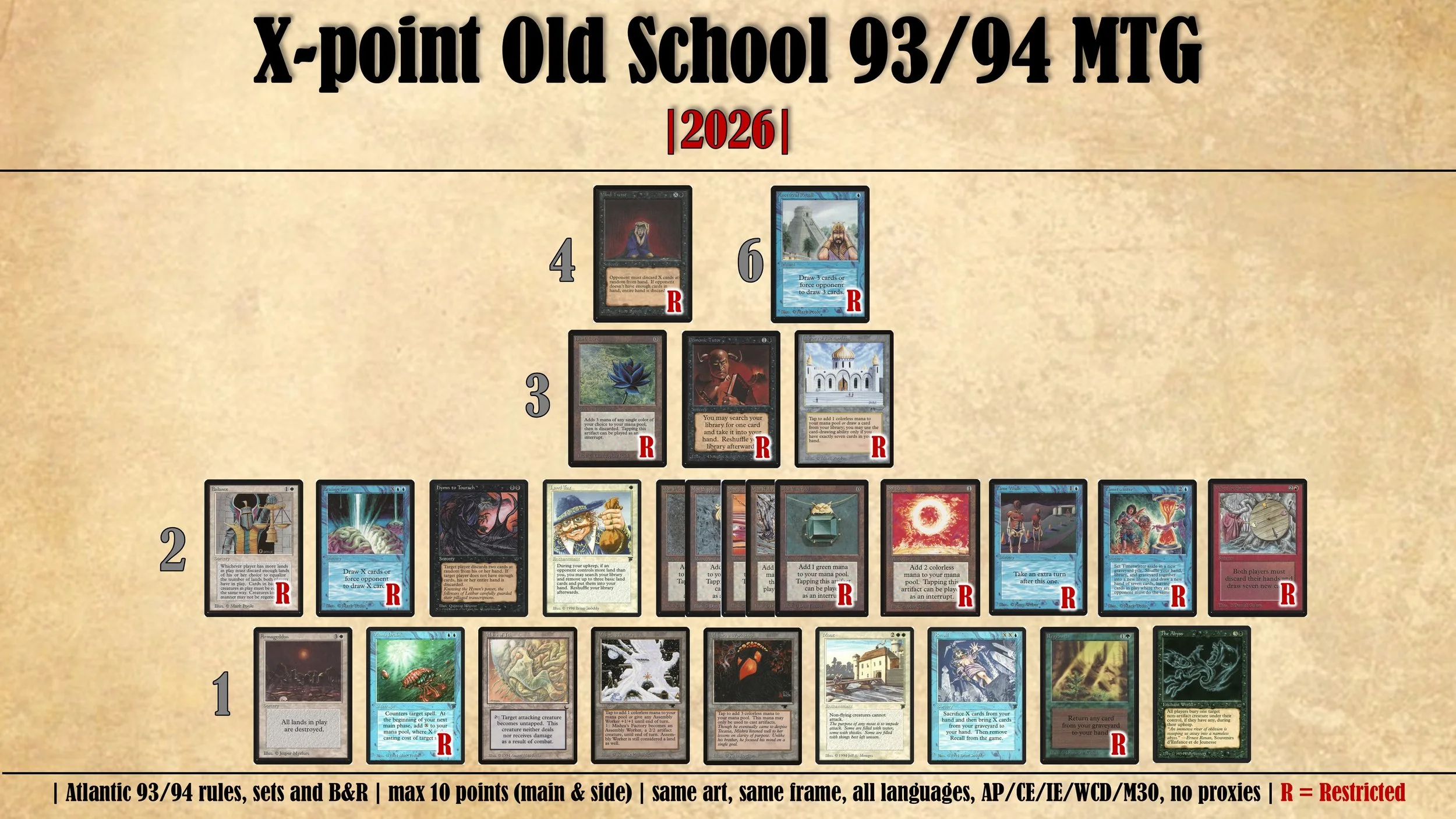 XX-Point is a unified ruleset that uses the current point list for X-Point Old School. Each player must build two decks that are unified legal meaning: no more than four of any one card, except basic lands, can appear across both decks, and no more than one of any restricted card can appear across both decks. Additionally, no more than ten points can appear in any one deck. You may have up to twenty points across both decks, but no more than ten points in each deck. Decks should be at least 60 cards and should not have sideboards. Each deck should be labeled Deck 1 and Deck 2.